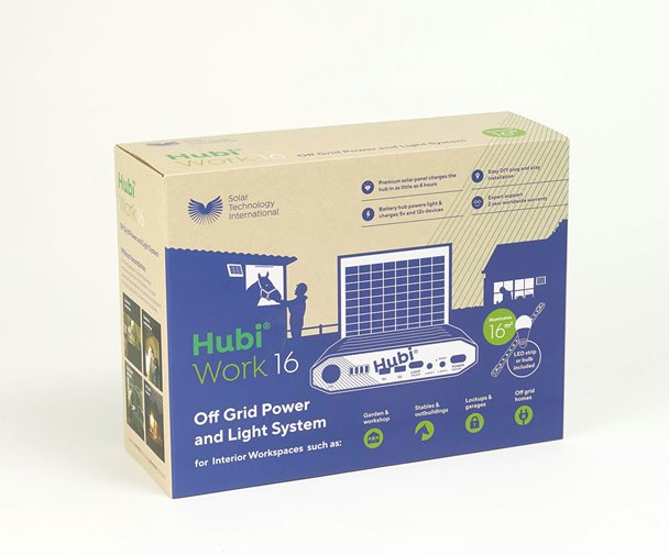 The kits contains a solar panel and wall bracket plus LED strip (or LED bulbs) and cables. No special wiring or tools are required. This Hubi Work 16 kit is perfect for a small shed, workshop or stable. The larger Hubi 64 kit, which comes with four LED lights of your choice, will light up four small rooms, or one large room.