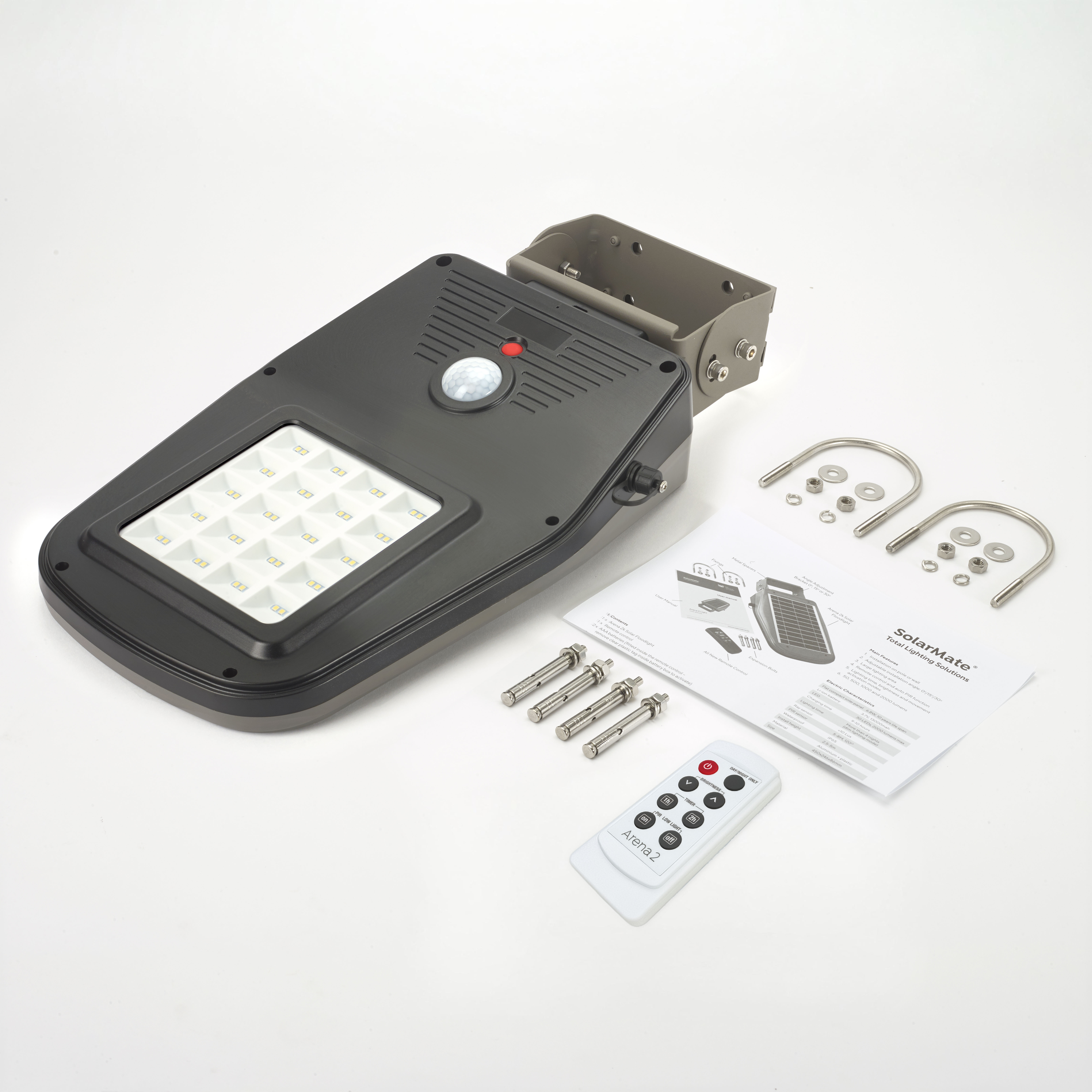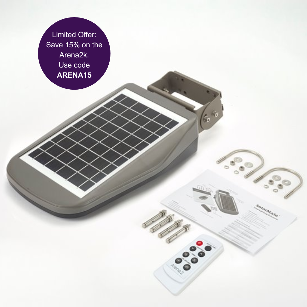 SolarMate Arena2K is a 2000 lumen brightness flood lighting system that is self powered using its highly efficient solar cell and internal lithium battery pack.