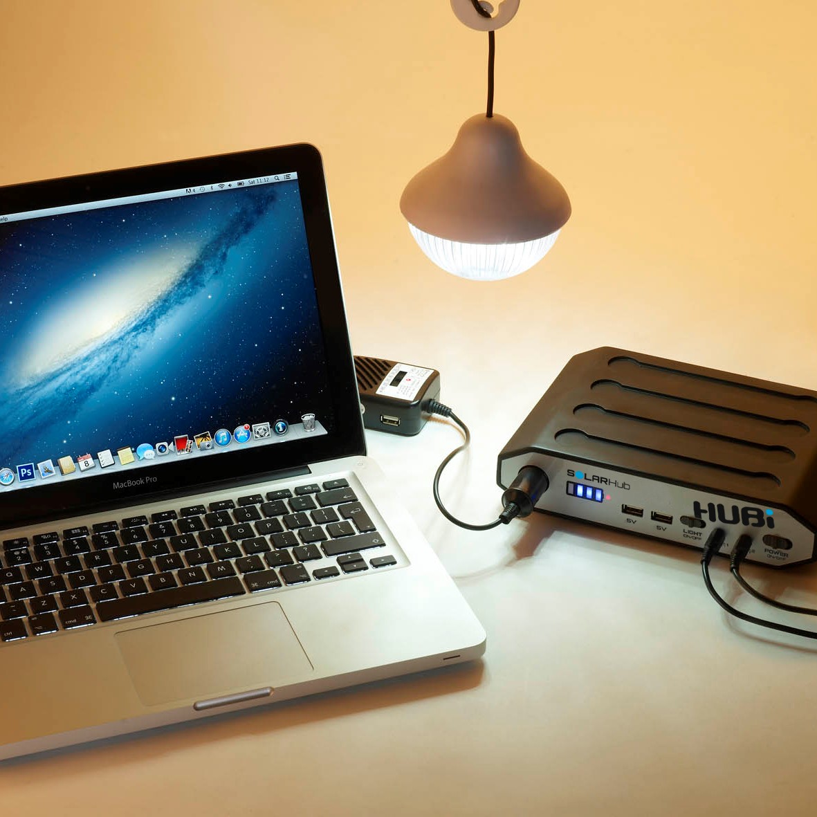 Hubi Go is a portable power and lighting system operating from a super-efficient solar panel. An ideal set up for homes, camping holidays or anywhere that is remote from a grid connection. Using a state of the art lithium battery hub and two bright lanterns, the Hubi Go is perfect for illumination and powering small devices at 5V DC (mobile phones, tablets etc) and 12V DC (TVs, compressors, lap tops etc).