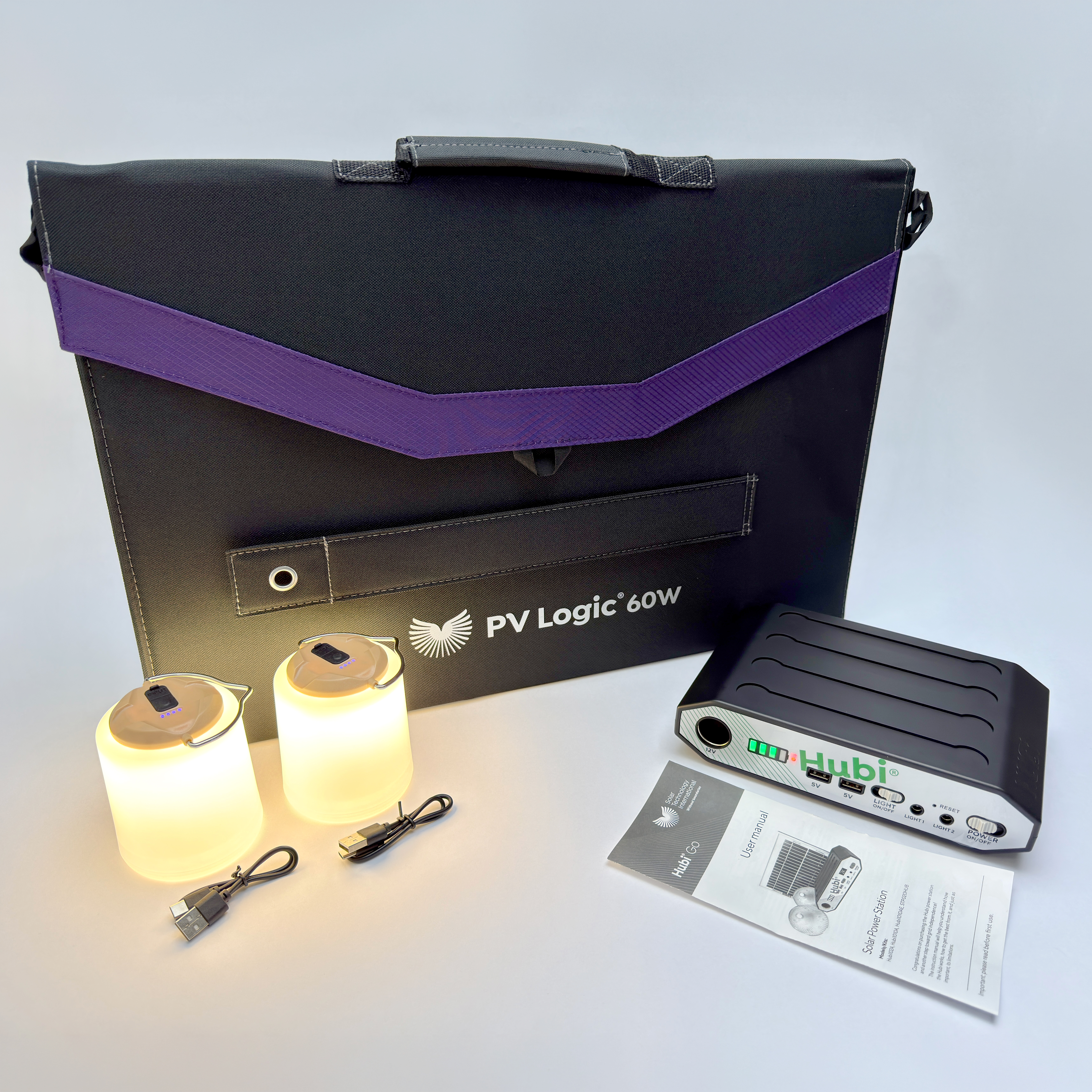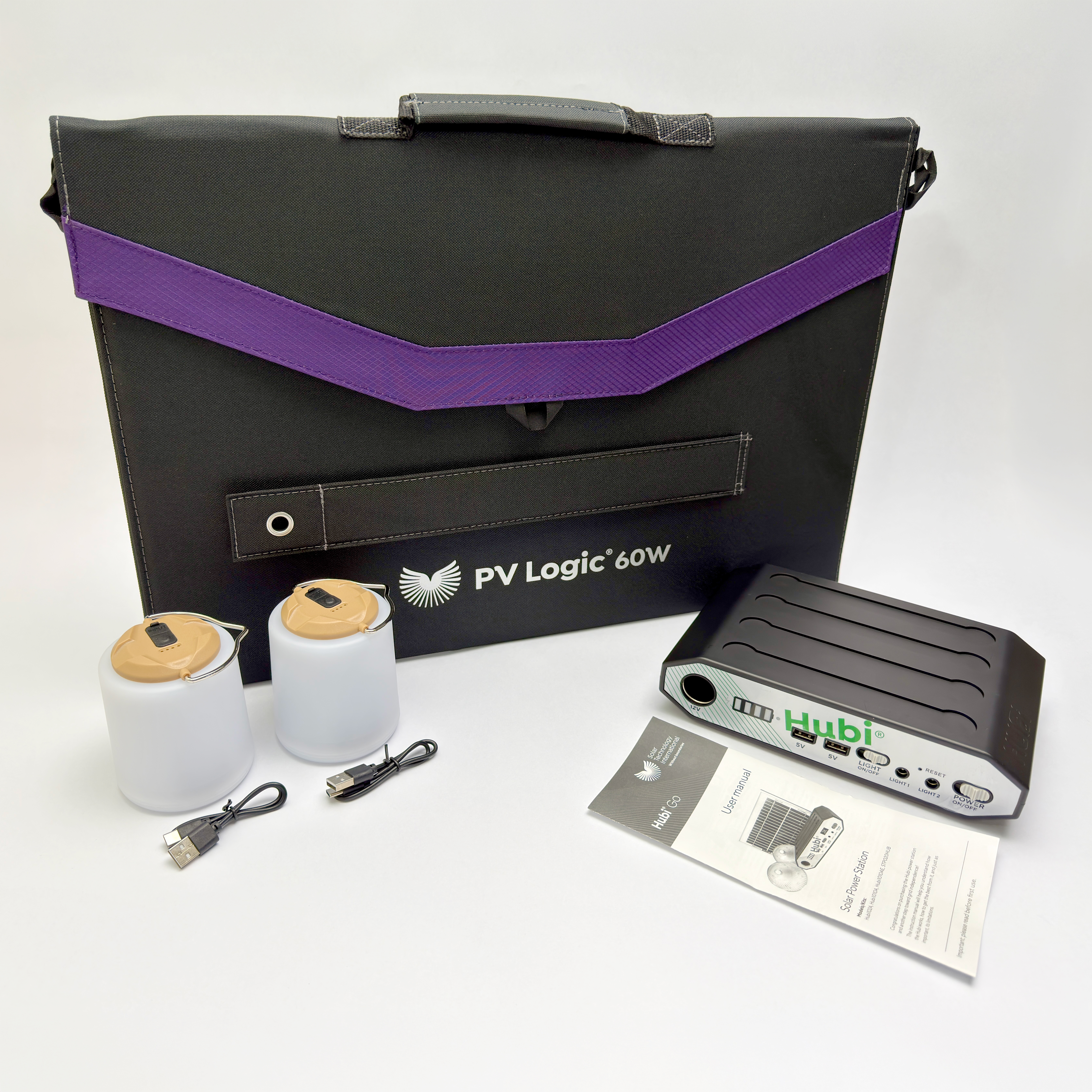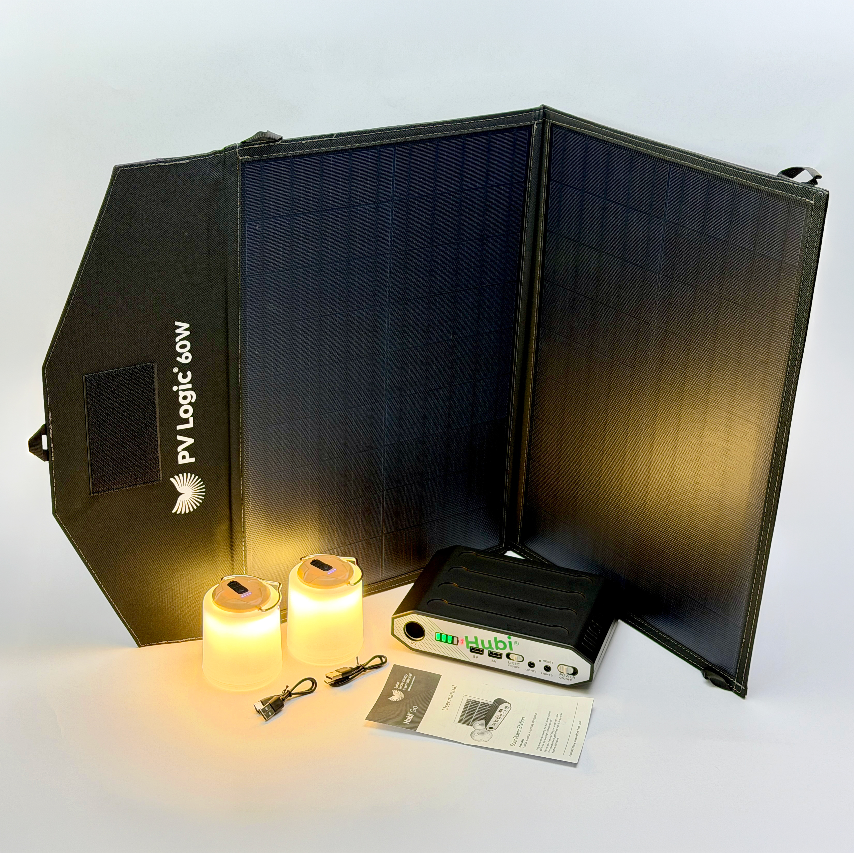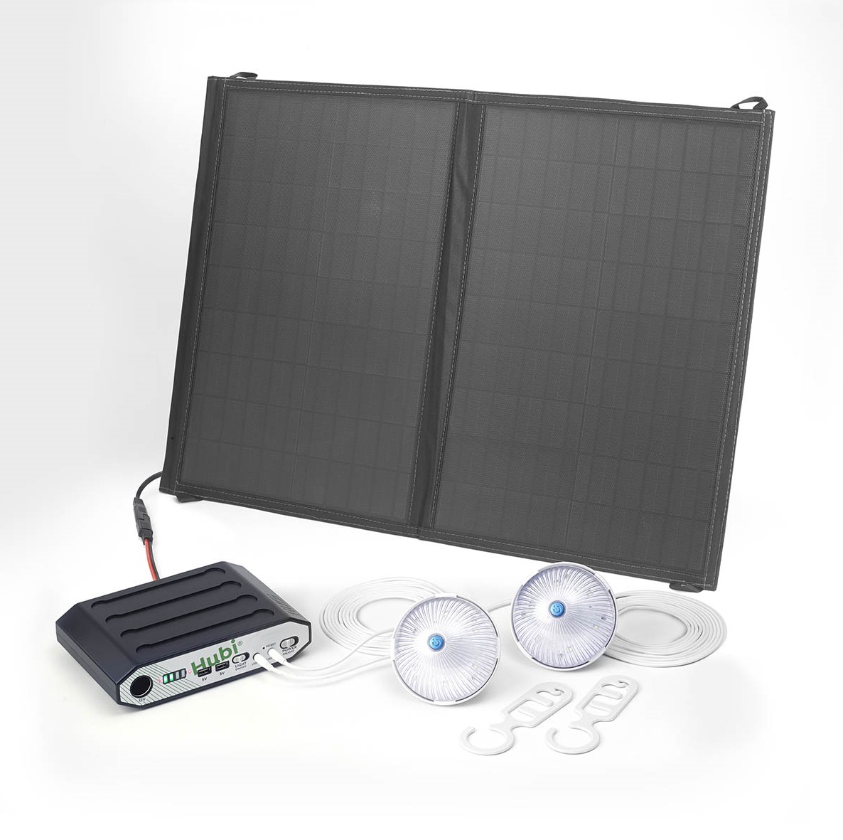Hubi Go Extreme is powered by a highly efficient 60W fold up solar panel that feeds the Hubi lithium battery pack, which in turn provides the power for our super bright lanterns and other devices.