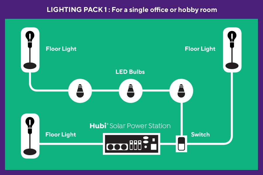 Lighting Pack 1 is specially designed for the Hubi Solar Power Station Premium range and is perfect for a hobby room or summer house. This pack includes our ceiling mounted 3W (equivalent to 60W) warm white bulbs and bulb holders for use with a light shade. Three modern floor lights with filament style 3.5W bulbs are also supplied along with cables and switches. The pack contains all you need to illuminate the room and the cabling to connect to the Power Station dashboard to get you up and running in minutes. ... View more