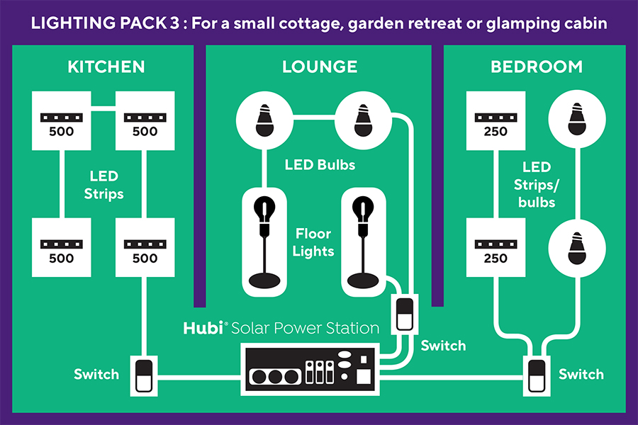 Lighting Pack 3 is specially designed for the Hubi Solar Power Station Premium range and is perfect for a small cottage, garden retreat or glamping cabin. It is the big one! Specially designed for multi roomed buildings, the kit includes bright LED strip lighting for the kitchen and bathroom areas, warm tone lighting for bedrooms and living spaces plus filament style floor and table lighting. It contains all you need to illuminate the rooms and the cabling to connect to the Power Station dashboard to get you up and running in minutes. ... View more