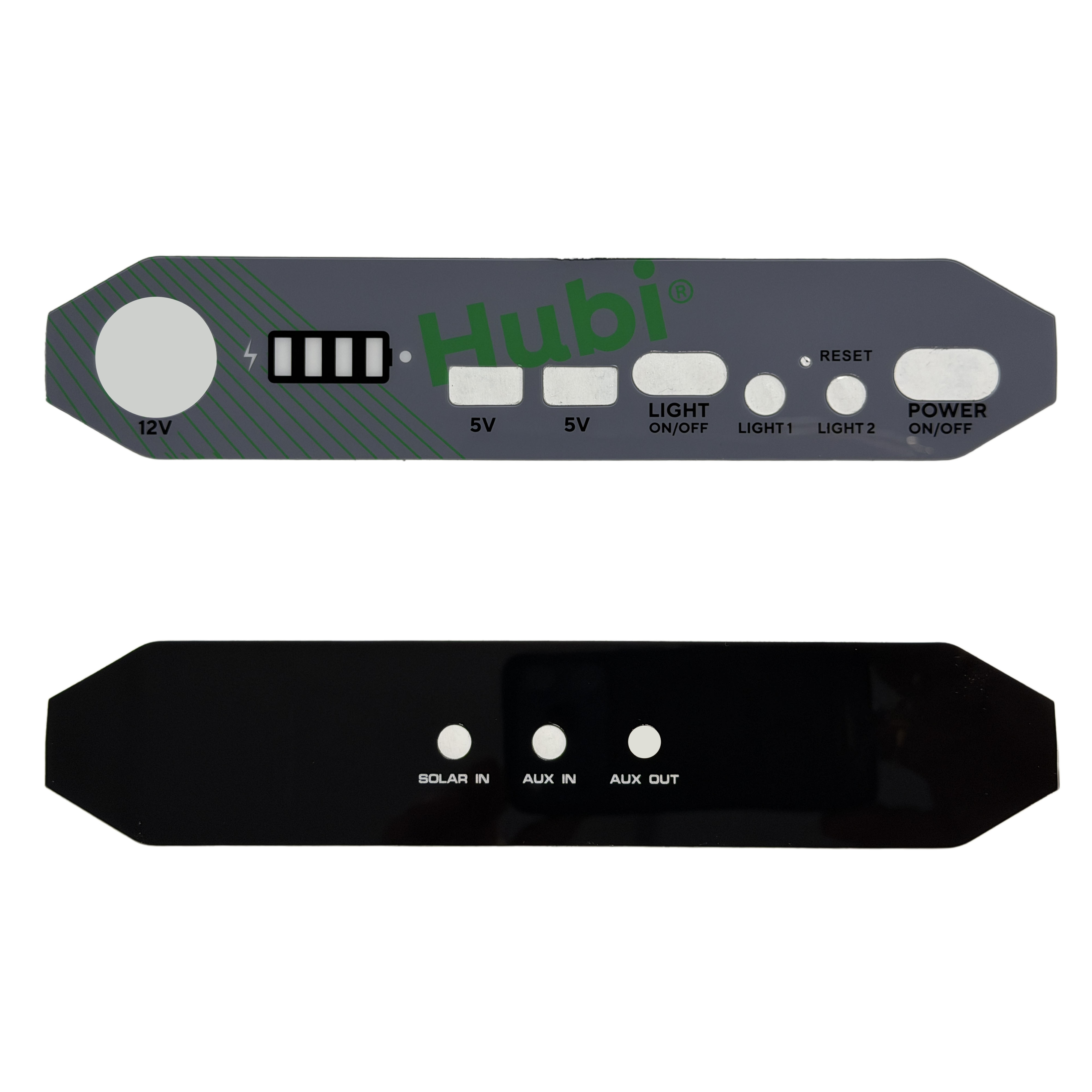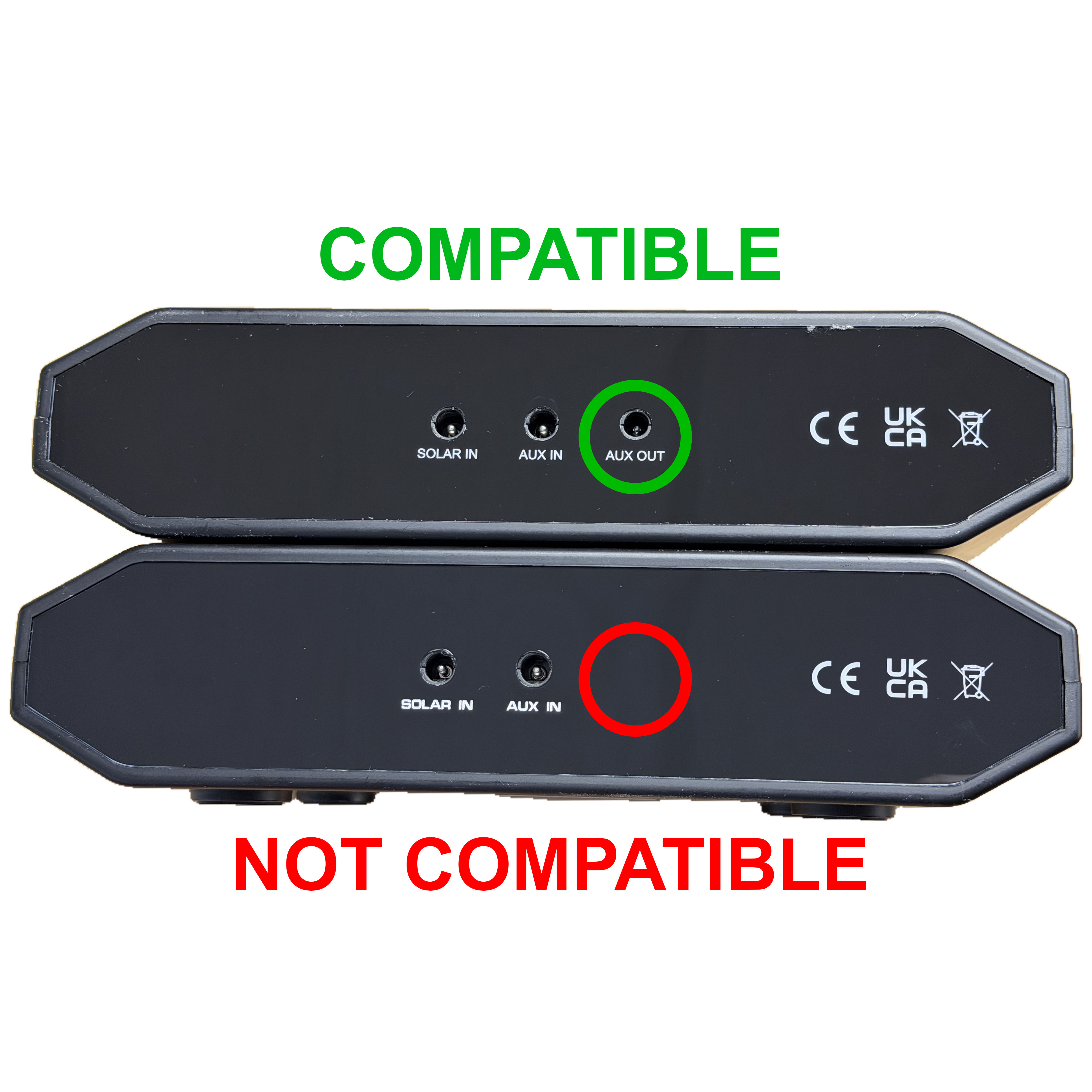 To confirm if this kit is compatible with your Hubi, check that there are three sockets located on the rear, labelled “Solar In,” “Aux In,” and “Aux Out.” If the “Aux Out” socket is missing, this kit is NOT compatible with your device.