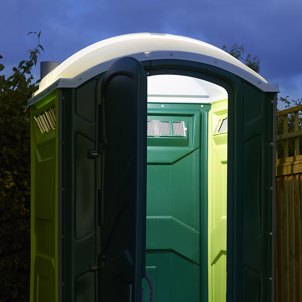The light switches on automatically when the door of the portable toilet is opened, and it will remain illuminated until 90 seconds after the user has left the cubicle. The clever design only floods the back and sides of the portable toilet and does not direct light into the eyes of the user, which can cause momentary disorientation.